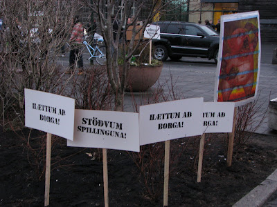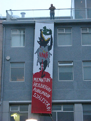 I am a bit more concerned about the political situation. Locally, this is gonna have huge consequences and especially if the director of the central bank of Iceland, Davið Oddsson, a former Prime Minister, leader of the independence party keep steering the Icelandic economic as he is doing now. He is getting more and more unpopular and many people both inside and outside the country (many people protested against him last Saturday). I think that Davið Oddson is working on his own interest and have an hidden agenda on the matter. I am sure that he is not gonna last long and that once the crisis will be over, the Party of Independence , his political will blow up in pieces. There is too many people in this party only working for their own interest. Internationally, i think that the crisis will have tough many things to Iceland. First of all, we as a nation are not prepared at all to deal with a media waves, and we do need a good PR to give the right information, second we found out who were really our friends and the British are not one of them, neither the European Union. Some countries have been taking advantage of the situation. As i have mentioned.. the British are not our friends any more ...have they been one day ? i do wonder...They froze our assets in UK forcing the Icelandic Government to take control of the biggest bank of the country. In order to froze our assets they used an anti-terrorist law voted after the September 11th, making Iceland one of the kind terrorist country in Europe and in the NATO organisation.(just for information, we do not have any army. Our policemen are not armed...). This is gonna have huge consequences.
